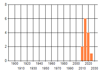 Het aantal atlasblokken (5x5 km) waarin de soort is gemeld binnen een periode van vijf jaar (vanaf 1980) of twintig jaar. Niet gecorrigeerd voor waarnemersinspanning en het aantal doorgegeven waarnemingen kan sterk variëren per periode, dus een trend in verspreiding kan hier niet direct uit worden afgelezen. Het opgegeven jaartal is het eerste jaar van de periode. Bron: gevalideerde waarnemingen uit de NDFF.