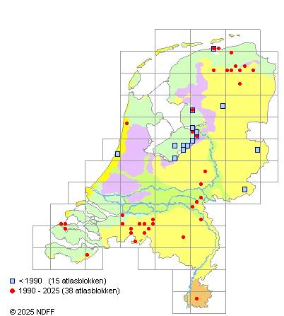 Het aantal atlasblokken (5x5 km) waarin de soort is gemeld binnen een periode van vijf jaar (vanaf 1980) of twintig jaar. Niet gecorrigeerd voor waarnemersinspanning en het aantal doorgegeven waarnemingen kan sterk variëren per periode, dus een trend in verspreiding kan hier niet direct uit worden afgelezen. Het opgegeven jaartal is het eerste jaar van de periode. Bron: gevalideerde waarnemingen uit de NDFF.