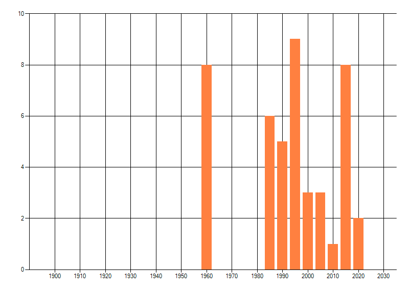 Het aantal atlasblokken (5x5 km) waarin de soort is gemeld binnen een periode van vijf jaar (vanaf 1980) of twintig jaar. Niet gecorrigeerd voor waarnemersinspanning en het aantal doorgegeven waarnemingen kan sterk variëren per periode, dus een trend in verspreiding kan hier niet direct uit worden afgelezen. Het opgegeven jaartal is het eerste jaar van de periode. Bron: gevalideerde waarnemingen uit de NDFF.