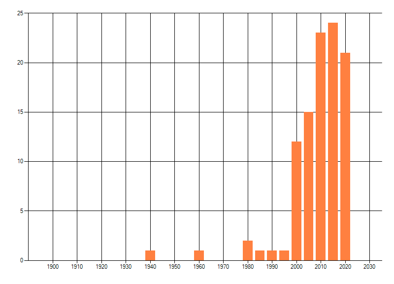 Het aantal atlasblokken (5x5 km) waarin de soort is gemeld binnen een periode van vijf jaar (vanaf 1980) of twintig jaar. Niet gecorrigeerd voor waarnemersinspanning en het aantal doorgegeven waarnemingen kan sterk variëren per periode, dus een trend in verspreiding kan hier niet direct uit worden afgelezen. Het opgegeven jaartal is het eerste jaar van de periode. Bron: gevalideerde waarnemingen uit de NDFF.