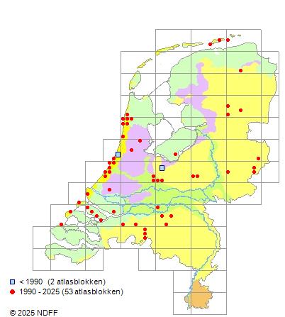 Het aantal atlasblokken (5x5 km) waarin de soort is gemeld binnen een periode van vijf jaar (vanaf 1980) of twintig jaar. Niet gecorrigeerd voor waarnemersinspanning en het aantal doorgegeven waarnemingen kan sterk variëren per periode, dus een trend in verspreiding kan hier niet direct uit worden afgelezen. Het opgegeven jaartal is het eerste jaar van de periode. Bron: gevalideerde waarnemingen uit de NDFF.