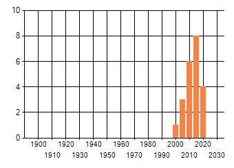 Het aantal atlasblokken (5x5 km) waarin de soort is gemeld binnen een periode van vijf jaar (vanaf 1980) of twintig jaar. Niet gecorrigeerd voor waarnemersinspanning en het aantal doorgegeven waarnemingen kan sterk variëren per periode, dus een trend in verspreiding kan hier niet direct uit worden afgelezen. Het opgegeven jaartal is het eerste jaar van de periode. Bron: gevalideerde waarnemingen uit de NDFF.