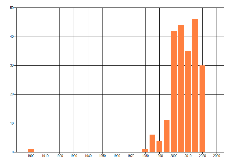 Het aantal atlasblokken (5x5 km) waarin de soort is gemeld binnen een periode van vijf jaar (vanaf 1980) of twintig jaar. Niet gecorrigeerd voor waarnemersinspanning en het aantal doorgegeven waarnemingen kan sterk variëren per periode, dus een trend in verspreiding kan hier niet direct uit worden afgelezen. Het opgegeven jaartal is het eerste jaar van de periode. Bron: gevalideerde waarnemingen uit de NDFF.