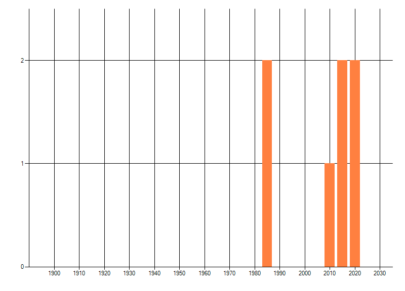 Het aantal atlasblokken (5x5 km) waarin de soort is gemeld binnen een periode van vijf jaar (vanaf 1980) of twintig jaar. Niet gecorrigeerd voor waarnemersinspanning en het aantal doorgegeven waarnemingen kan sterk variëren per periode, dus een trend in verspreiding kan hier niet direct uit worden afgelezen. Het opgegeven jaartal is het eerste jaar van de periode. Bron: gevalideerde waarnemingen uit de NDFF.