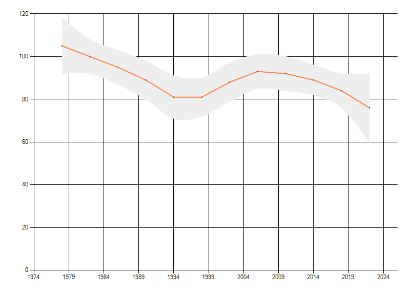 Gemiddelde trend van het aantal kilometerhokken waarin de soort voorkomt, weergegeven als indexcijfer (1975-1978 = 100). De trend is gecorrigeerd voor waarnemersinspanning en geeft de relatieve verandering in het aantal bezette kilometerhokken weer. Voor de berekening worden de data per periode van vier jaar samengenomen. In de grafiek correspondeert ieder punt met het laatste jaar van zo'n periode.