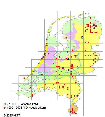 Het aantal atlasblokken (5x5 km) waarin de soort is gemeld binnen een periode van vijf jaar (vanaf 1980) of twintig jaar. Niet gecorrigeerd voor waarnemersinspanning en het aantal doorgegeven waarnemingen kan sterk variëren per periode, dus een trend in verspreiding kan hier niet direct uit worden afgelezen. Het opgegeven jaartal is het eerste jaar van de periode. Bron: gevalideerde waarnemingen uit de NDFF.