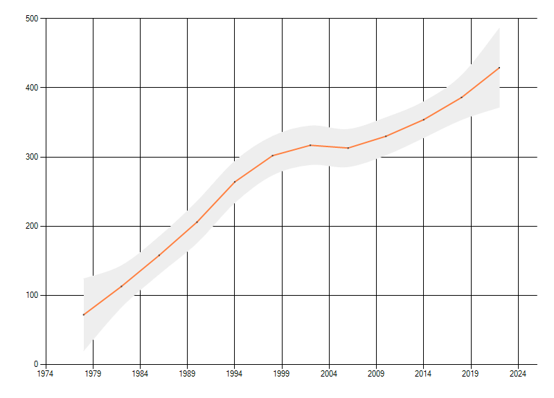 In de grafiek correspondeert ieder punt met het laatste jaar van zo'n periode.