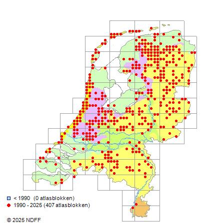 Het aantal atlasblokken (5x5 km) waarin de soort is gemeld binnen een periode van vijf jaar (vanaf 1980) of twintig jaar. Niet gecorrigeerd voor waarnemersinspanning en het aantal doorgegeven waarnemingen kan sterk variëren per periode, dus een trend in verspreiding kan hier niet direct uit worden afgelezen. Het opgegeven jaartal is het eerste jaar van de periode. Bron: gevalideerde waarnemingen uit de NDFF.