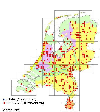 Het aantal atlasblokken (5x5 km) waarin de soort is gemeld binnen een periode van vijf jaar (vanaf 1980) of twintig jaar. Niet gecorrigeerd voor waarnemersinspanning en het aantal doorgegeven waarnemingen kan sterk variëren per periode, dus een trend in verspreiding kan hier niet direct uit worden afgelezen. Het opgegeven jaartal is het eerste jaar van de periode. Bron: gevalideerde waarnemingen uit de NDFF.