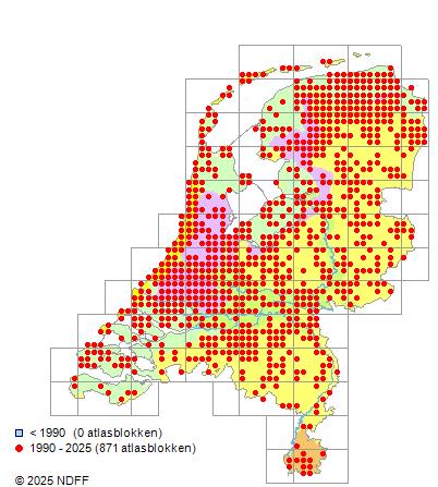 Het aantal atlasblokken (5x5 km) waarin de soort is gemeld binnen een periode van vijf jaar (vanaf 1980) of twintig jaar. Niet gecorrigeerd voor waarnemersinspanning en het aantal doorgegeven waarnemingen kan sterk variëren per periode, dus een trend in verspreiding kan hier niet direct uit worden afgelezen. Het opgegeven jaartal is het eerste jaar van de periode. Bron: gevalideerde waarnemingen uit de NDFF.