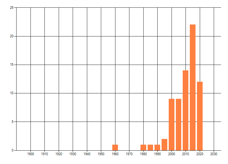 Het aantal atlasblokken (5x5 km) waarin de soort is gemeld binnen een periode van vijf jaar (vanaf 1980) of twintig jaar. Niet gecorrigeerd voor waarnemersinspanning en het aantal doorgegeven waarnemingen kan sterk variëren per periode, dus een trend in verspreiding kan hier niet direct uit worden afgelezen. Het opgegeven jaartal is het eerste jaar van de periode. Bron: gevalideerde waarnemingen uit de NDFF.