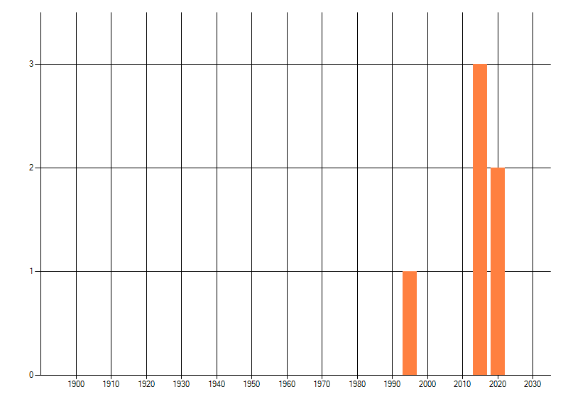Het aantal atlasblokken (5x5 km) waarin de soort is gemeld binnen een periode van vijf jaar (vanaf 1980) of twintig jaar. Niet gecorrigeerd voor waarnemersinspanning en het aantal doorgegeven waarnemingen kan sterk variëren per periode, dus een trend in verspreiding kan hier niet direct uit worden afgelezen. Het opgegeven jaartal is het eerste jaar van de periode. Bron: gevalideerde waarnemingen uit de NDFF.