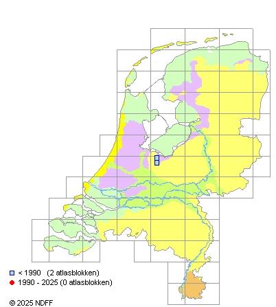 Het aantal atlasblokken (5x5 km) waarin de soort is gemeld binnen een periode van vijf jaar (vanaf 1980) of twintig jaar. Niet gecorrigeerd voor waarnemersinspanning en het aantal doorgegeven waarnemingen kan sterk variëren per periode, dus een trend in verspreiding kan hier niet direct uit worden afgelezen. Het opgegeven jaartal is het eerste jaar van de periode. Bron: gevalideerde waarnemingen uit de NDFF.