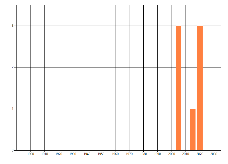 Het aantal atlasblokken (5x5 km) waarin de soort is gemeld binnen een periode van vijf jaar (vanaf 1980) of twintig jaar. Niet gecorrigeerd voor waarnemersinspanning en het aantal doorgegeven waarnemingen kan sterk variëren per periode, dus een trend in verspreiding kan hier niet direct uit worden afgelezen. Het opgegeven jaartal is het eerste jaar van de periode. Bron: gevalideerde waarnemingen uit de NDFF.