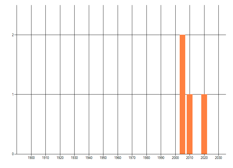 Het aantal atlasblokken (5x5 km) waarin de soort is gemeld binnen een periode van vijf jaar (vanaf 1980) of twintig jaar. Niet gecorrigeerd voor waarnemersinspanning en het aantal doorgegeven waarnemingen kan sterk variëren per periode, dus een trend in verspreiding kan hier niet direct uit worden afgelezen. Het opgegeven jaartal is het eerste jaar van de periode. Bron: gevalideerde waarnemingen uit de NDFF.