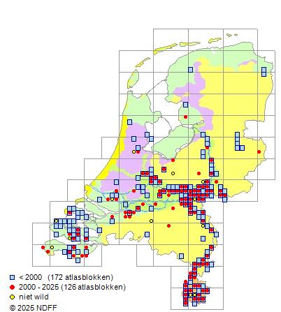 CC BY-NC-SA 3.0 NLVerspreidingNederlandPlaatselijk vrij algemeen langs spoorwegen, zeldzaam in Zuid-Limburg en het rivierengebied en zeer zeldzaam in Zeeland.