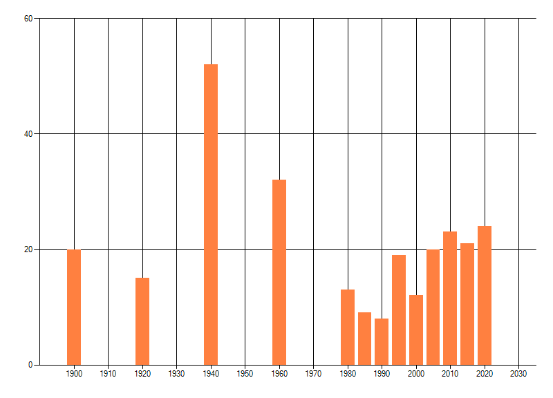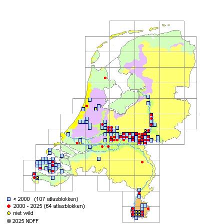 Het aantal atlasblokken (5x5 km) waarin de soort is gemeld binnen een periode van vijf jaar (vanaf 1980) of twintig jaar. Niet gecorrigeerd voor waarnemersinspanning en het aantal doorgegeven waarnemingen kan sterk variëren per periode, dus een trend in verspreiding kan hier niet direct uit worden afgelezen. Het opgegeven jaartal is het eerste jaar van de periode. Bron: gevalideerde waarnemingen uit de NDFF.