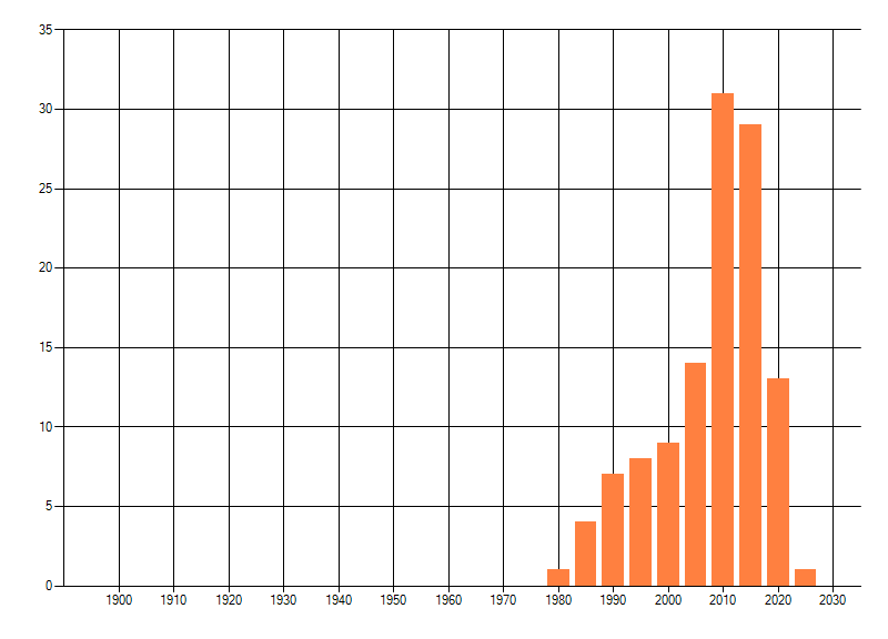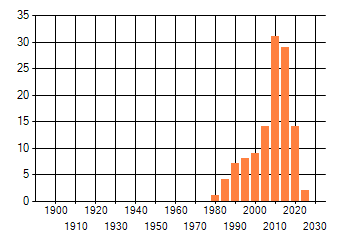 Het aantal atlasblokken (5x5 km) waarin de soort is gemeld binnen een periode van vijf jaar (vanaf 1980) of twintig jaar. Niet gecorrigeerd voor waarnemersinspanning en het aantal doorgegeven waarnemingen kan sterk variëren per periode, dus een trend in verspreiding kan hier niet direct uit worden afgelezen. Het opgegeven jaartal is het eerste jaar van de periode. Bron: gevalideerde waarnemingen uit de NDFF.
