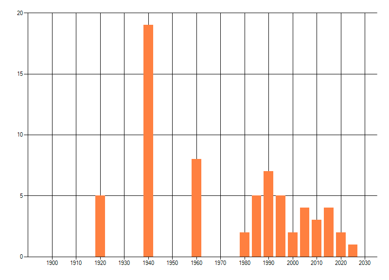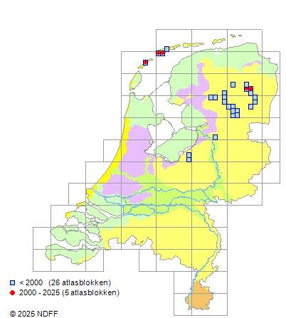 Het aantal atlasblokken (5x5 km) waarin de soort is gemeld binnen een periode van vijf jaar (vanaf 1980) of twintig jaar. Niet gecorrigeerd voor waarnemersinspanning en het aantal doorgegeven waarnemingen kan sterk variëren per periode, dus een trend in verspreiding kan hier niet direct uit worden afgelezen. Het opgegeven jaartal is het eerste jaar van de periode. Bron: gevalideerde waarnemingen uit de NDFF.