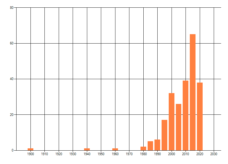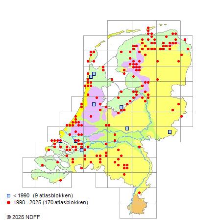 Het aantal atlasblokken (5x5 km) waarin de soort is gemeld binnen een periode van vijf jaar (vanaf 1980) of twintig jaar. Niet gecorrigeerd voor waarnemersinspanning en het aantal doorgegeven waarnemingen kan sterk variëren per periode, dus een trend in verspreiding kan hier niet direct uit worden afgelezen. Het opgegeven jaartal is het eerste jaar van de periode. Bron: gevalideerde waarnemingen uit de NDFF.