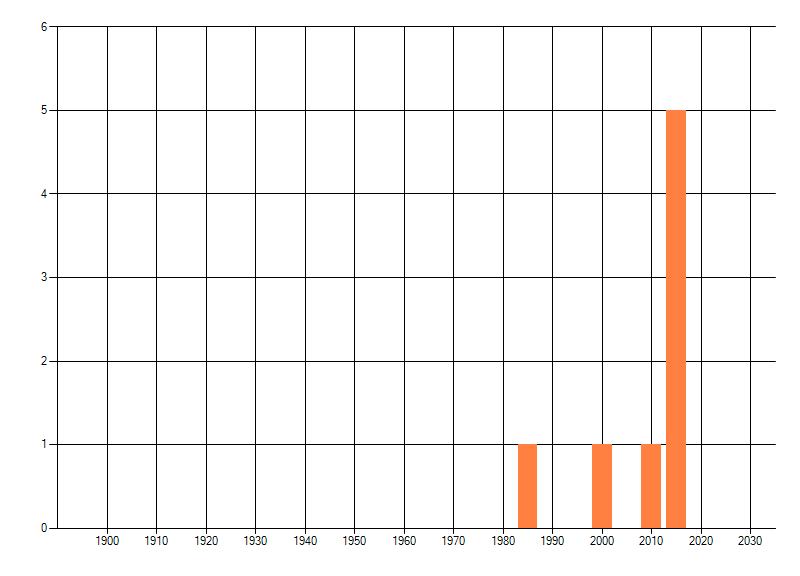 Het aantal atlasblokken (5x5 km) waarin de soort is gemeld binnen een periode van vijf jaar (vanaf 1980) of twintig jaar. Niet gecorrigeerd voor waarnemersinspanning en het aantal doorgegeven waarnemingen kan sterk variëren per periode, dus een trend in verspreiding kan hier niet direct uit worden afgelezen. Het opgegeven jaartal is het eerste jaar van de periode. Bron: gevalideerde waarnemingen uit de NDFF.