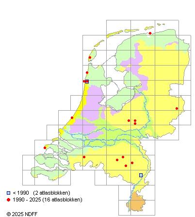 Het aantal atlasblokken (5x5 km) waarin de soort is gemeld binnen een periode van vijf jaar (vanaf 1980) of twintig jaar. Niet gecorrigeerd voor waarnemersinspanning en het aantal doorgegeven waarnemingen kan sterk variëren per periode, dus een trend in verspreiding kan hier niet direct uit worden afgelezen. Het opgegeven jaartal is het eerste jaar van de periode. Bron: gevalideerde waarnemingen uit de NDFF.