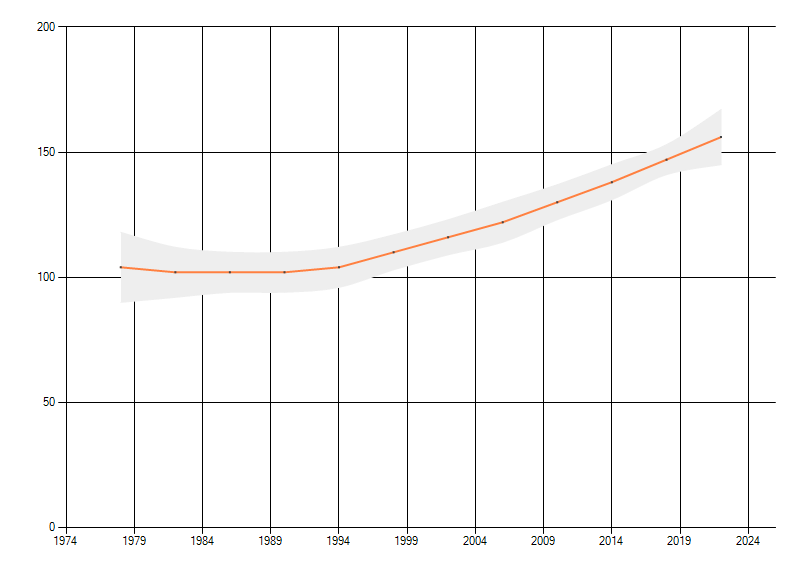 Gemiddelde trend van het aantal kilometerhokken waarin de soort voorkomt, weergegeven als indexcijfer (1975-1978 = 100).