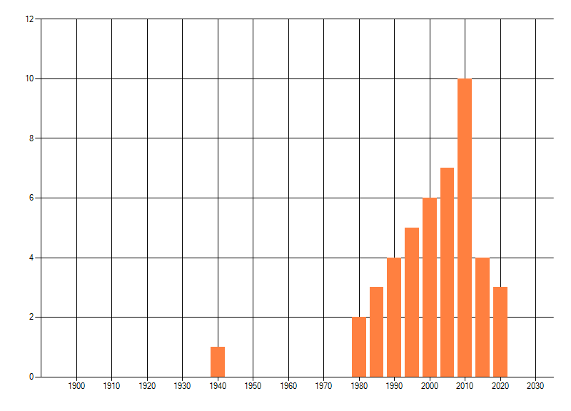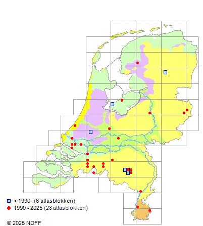 Het aantal atlasblokken (5x5 km) waarin de soort is gemeld binnen een periode van vijf jaar (vanaf 1980) of twintig jaar. Niet gecorrigeerd voor waarnemersinspanning en het aantal doorgegeven waarnemingen kan sterk variëren per periode, dus een trend in verspreiding kan hier niet direct uit worden afgelezen. Het opgegeven jaartal is het eerste jaar van de periode. Bron: gevalideerde waarnemingen uit de NDFF.
