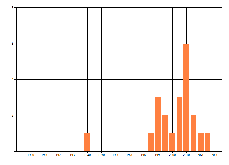 Het aantal atlasblokken (5x5 km) waarin de soort is gemeld binnen een periode van vijf jaar (vanaf 1980) of twintig jaar. Niet gecorrigeerd voor waarnemersinspanning en het aantal doorgegeven waarnemingen kan sterk variëren per periode, dus een trend in verspreiding kan hier niet direct uit worden afgelezen. Het opgegeven jaartal is het eerste jaar van de periode. Bron: gevalideerde waarnemingen uit de NDFF.