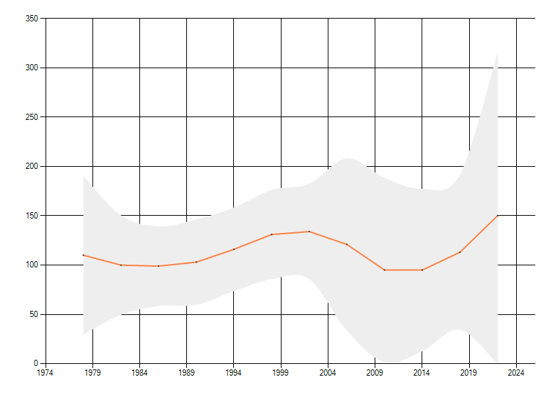 Gemiddelde trend van het aantal kilometerhokken waarin de soort voorkomt, weergegeven als indexcijfer (1975-1978 = 100). De trend is gecorrigeerd voor waarnemersinspanning en geeft de relatieve verandering in het aantal bezette kilometerhokken weer. Voor de berekening worden de data per periode van vier jaar samengenomen. In de grafiek correspondeert ieder punt met het laatste jaar van zo'n periode.