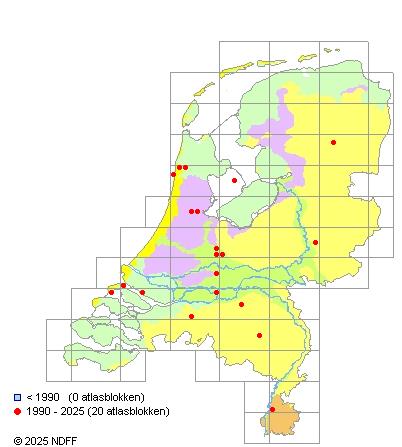 Het aantal atlasblokken (5x5 km) waarin de soort is gemeld binnen een periode van vijf jaar (vanaf 1980) of twintig jaar.