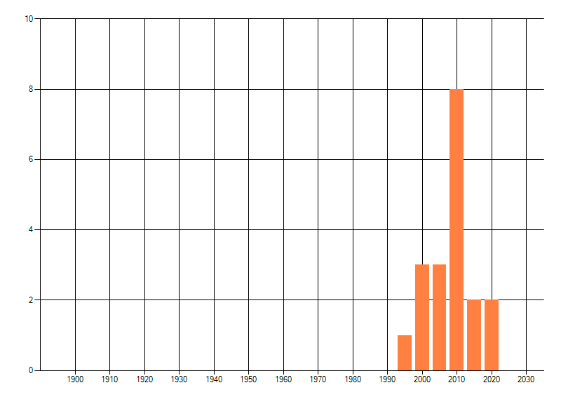 Het aantal atlasblokken (5x5 km) waarin de soort is gemeld binnen een periode van vijf jaar (vanaf 1980) of twintig jaar. Niet gecorrigeerd voor waarnemersinspanning en het aantal doorgegeven waarnemingen kan sterk variëren per periode, dus een trend in verspreiding kan hier niet direct uit worden afgelezen. Het opgegeven jaartal is het eerste jaar van de periode. Bron: gevalideerde waarnemingen uit de NDFF.