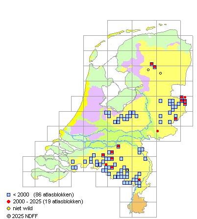 Het aantal atlasblokken (5x5 km) waarin de soort is gemeld binnen een periode van vijf jaar (vanaf 1980) of twintig jaar. Niet gecorrigeerd voor waarnemersinspanning en het aantal doorgegeven waarnemingen kan sterk variëren per periode, dus een trend in verspreiding kan hier niet direct uit worden afgelezen. Het opgegeven jaartal is het eerste jaar van de periode. Bron: gevalideerde waarnemingen uit de NDFF.