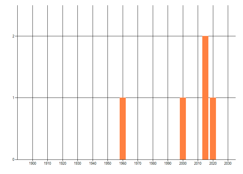 Het aantal atlasblokken (5x5 km) waarin de soort is gemeld binnen een periode van vijf jaar (vanaf 1980) of twintig jaar. Niet gecorrigeerd voor waarnemersinspanning en het aantal doorgegeven waarnemingen kan sterk variëren per periode, dus een trend in verspreiding kan hier niet direct uit worden afgelezen. Het opgegeven jaartal is het eerste jaar van de periode. Bron: gevalideerde waarnemingen uit de NDFF.