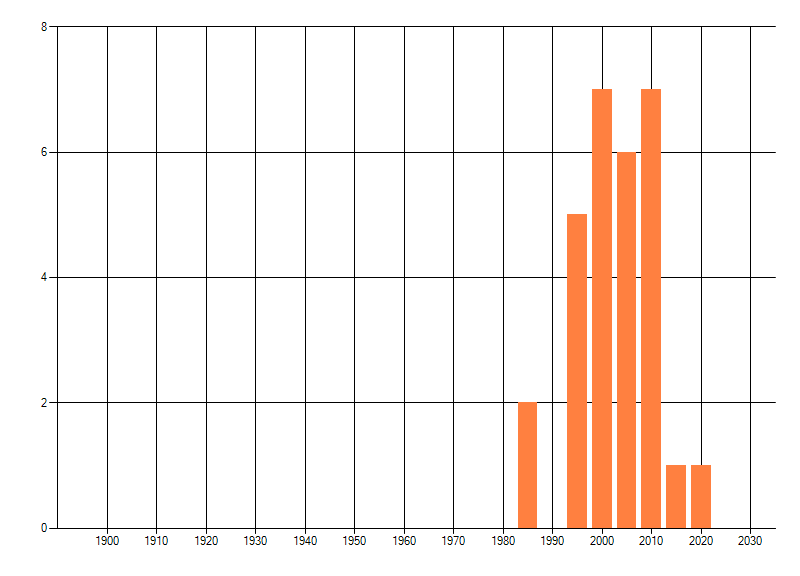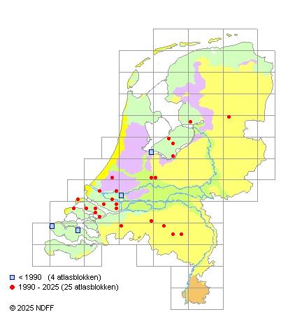 Het aantal atlasblokken (5x5 km) waarin de soort is gemeld binnen een periode van vijf jaar (vanaf 1980) of twintig jaar. Niet gecorrigeerd voor waarnemersinspanning en het aantal doorgegeven waarnemingen kan sterk variëren per periode, dus een trend in verspreiding kan hier niet direct uit worden afgelezen. Het opgegeven jaartal is het eerste jaar van de periode. Bron: gevalideerde waarnemingen uit de NDFF.