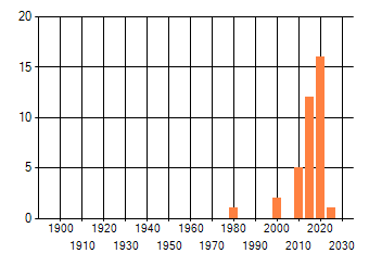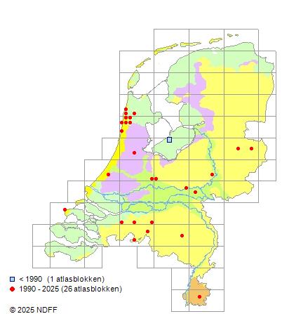 Het aantal atlasblokken (5x5 km) waarin de soort is gemeld binnen een periode van vijf jaar (vanaf 1980) of twintig jaar. Niet gecorrigeerd voor waarnemersinspanning en het aantal doorgegeven waarnemingen kan sterk variëren per periode, dus een trend in verspreiding kan hier niet direct uit worden afgelezen. Het opgegeven jaartal is het eerste jaar van de periode. Bron: gevalideerde waarnemingen uit de NDFF.