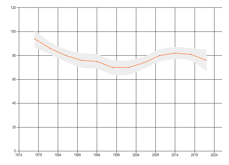 Gemiddelde trend van het aantal kilometerhokken waarin de soort voorkomt, weergegeven als indexcijfer (1975-1978 = 100).