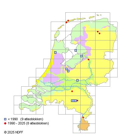 Het aantal atlasblokken (5x5 km) waarin de soort is gemeld binnen een periode van vijf jaar (vanaf 1980) of twintig jaar. Niet gecorrigeerd voor waarnemersinspanning en het aantal doorgegeven waarnemingen kan sterk variëren per periode, dus een trend in verspreiding kan hier niet direct uit worden afgelezen. Het opgegeven jaartal is het eerste jaar van de periode. Bron: gevalideerde waarnemingen uit de NDFF.