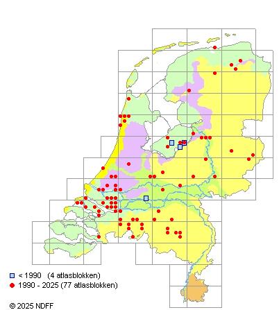 Het aantal atlasblokken (5x5 km) waarin de soort is gemeld binnen een periode van vijf jaar (vanaf 1980) of twintig jaar. Niet gecorrigeerd voor waarnemersinspanning en het aantal doorgegeven waarnemingen kan sterk variëren per periode, dus een trend in verspreiding kan hier niet direct uit worden afgelezen. Het opgegeven jaartal is het eerste jaar van de periode. Bron: gevalideerde waarnemingen uit de NDFF.