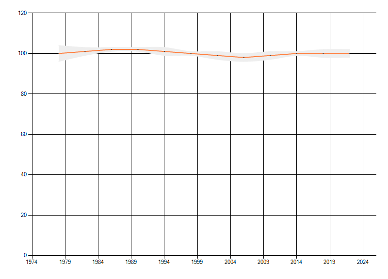 Gemiddelde trend van het aantal kilometerhokken waarin de soort voorkomt, weergegeven als indexcijfer (1975-1978 = 100).