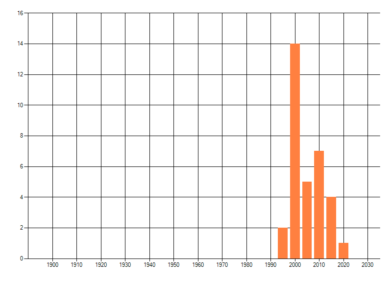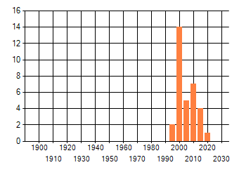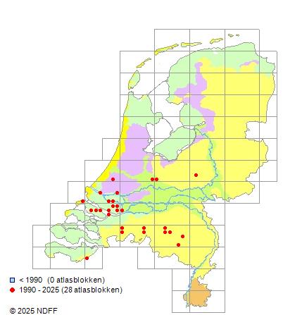 Het aantal atlasblokken (5x5 km) waarin de soort is gemeld binnen een periode van vijf jaar (vanaf 1980) of twintig jaar. Niet gecorrigeerd voor waarnemersinspanning en het aantal doorgegeven waarnemingen kan sterk variëren per periode, dus een trend in verspreiding kan hier niet direct uit worden afgelezen. Het opgegeven jaartal is het eerste jaar van de periode. Bron: gevalideerde waarnemingen uit de NDFF.