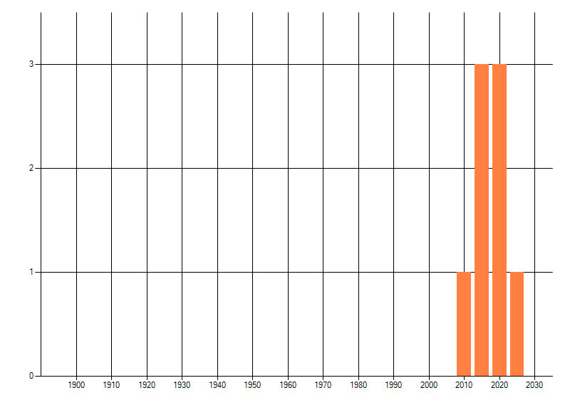 Het aantal atlasblokken (5x5 km) waarin de soort is gemeld binnen een periode van vijf jaar (vanaf 1980) of twintig jaar. Niet gecorrigeerd voor waarnemersinspanning en het aantal doorgegeven waarnemingen kan sterk variëren per periode, dus een trend in verspreiding kan hier niet direct uit worden afgelezen. Het opgegeven jaartal is het eerste jaar van de periode. Bron: gevalideerde waarnemingen uit de NDFF.