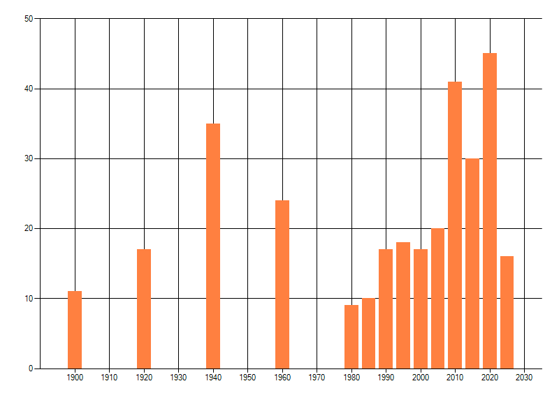 Het aantal atlasblokken (5x5 km) waarin de soort is gemeld binnen een periode van vijf jaar (vanaf 1980) of twintig jaar. Niet gecorrigeerd voor waarnemersinspanning en het aantal doorgegeven waarnemingen kan sterk variëren per periode, dus een trend in verspreiding kan hier niet direct uit worden afgelezen. Het opgegeven jaartal is het eerste jaar van de periode. Bron: gevalideerde waarnemingen uit de NDFF.