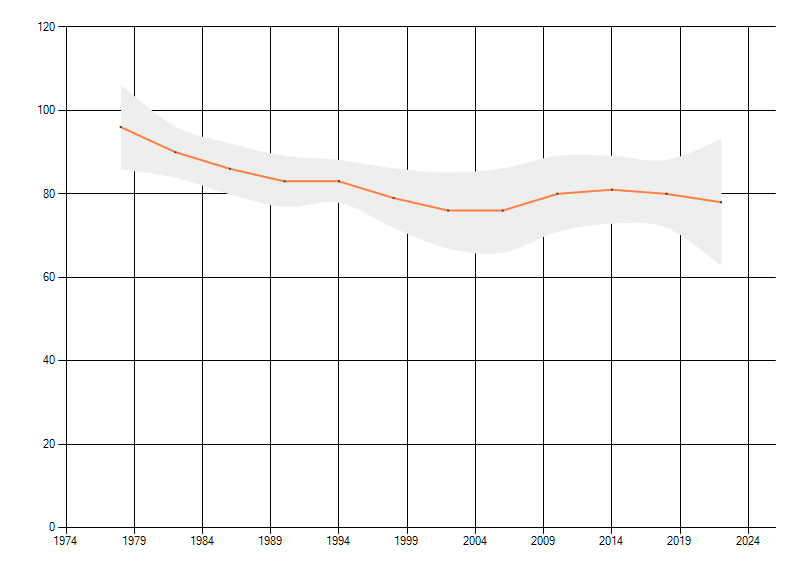 Gemiddelde trend van het aantal kilometerhokken waarin de soort voorkomt, weergegeven als indexcijfer (1975-1978 = 100). De trend is gecorrigeerd voor waarnemersinspanning en geeft de relatieve verandering in het aantal bezette kilometerhokken weer. Voor de berekening worden de data per periode van vier jaar samengenomen. In de grafiek correspondeert ieder punt met het laatste jaar van zo'n periode.