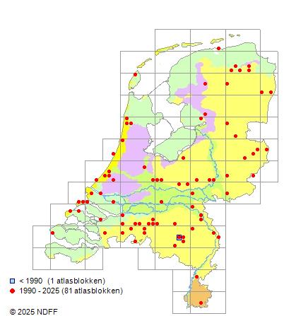 Het aantal atlasblokken (5x5 km) waarin de soort is gemeld binnen een periode van vijf jaar (vanaf 1980) of twintig jaar. Niet gecorrigeerd voor waarnemersinspanning en het aantal doorgegeven waarnemingen kan sterk variëren per periode, dus een trend in verspreiding kan hier niet direct uit worden afgelezen. Het opgegeven jaartal is het eerste jaar van de periode. Bron: gevalideerde waarnemingen uit de NDFF.