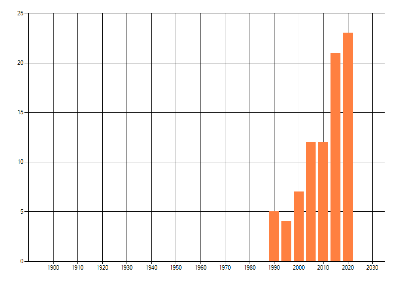 Het aantal atlasblokken (5x5 km) waarin de soort is gemeld binnen een periode van vijf jaar (vanaf 1980) of twintig jaar. Niet gecorrigeerd voor waarnemersinspanning en het aantal doorgegeven waarnemingen kan sterk variëren per periode, dus een trend in verspreiding kan hier niet direct uit worden afgelezen. Het opgegeven jaartal is het eerste jaar van de periode. Bron: gevalideerde waarnemingen uit de NDFF.