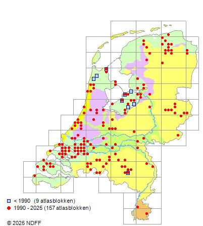 Het aantal atlasblokken (5x5 km) waarin de soort is gemeld binnen een periode van vijf jaar (vanaf 1980) of twintig jaar. Niet gecorrigeerd voor waarnemersinspanning en het aantal doorgegeven waarnemingen kan sterk variëren per periode, dus een trend in verspreiding kan hier niet direct uit worden afgelezen. Het opgegeven jaartal is het eerste jaar van de periode. Bron: gevalideerde waarnemingen uit de NDFF.