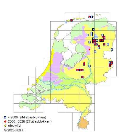 CC BY-NC-SA 3.0 NLVerspreidingNederlandZeldzaam in Drenthe en Zuidoost-Fryslân en zeer zeldzaam op Terschelling, Schiermonnikoog en in het midden van het land.