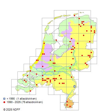 Het aantal atlasblokken (5x5 km) waarin de soort is gemeld binnen een periode van vijf jaar (vanaf 1980) of twintig jaar. Niet gecorrigeerd voor waarnemersinspanning en het aantal doorgegeven waarnemingen kan sterk variëren per periode, dus een trend in verspreiding kan hier niet direct uit worden afgelezen. Het opgegeven jaartal is het eerste jaar van de periode. Bron: gevalideerde waarnemingen uit de NDFF.