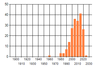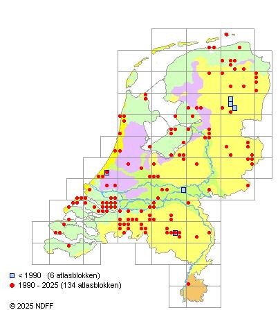 Het aantal atlasblokken (5x5 km) waarin de soort is gemeld binnen een periode van vijf jaar (vanaf 1980) of twintig jaar. Niet gecorrigeerd voor waarnemersinspanning en het aantal doorgegeven waarnemingen kan sterk variëren per periode, dus een trend in verspreiding kan hier niet direct uit worden afgelezen. Het opgegeven jaartal is het eerste jaar van de periode. Bron: gevalideerde waarnemingen uit de NDFF.